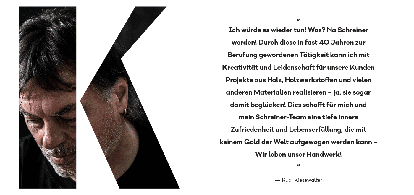 Traditionelles Handwerk trifft Leidenschaft. Die holzwerkstatt kiesewalter lebt das Handwerk. Die Begeisterung zum individuellen und kreativen Gestalten mit Holz ist ihre Leidenschaft. Wir hatten das Vergnügen, diese Individualität und Leidenschaft in den Fokus zu rücken und der holzwerkstatt kiesewalter einen neuen Look zu verschaffen. Dies beinhaltete unter anderem Branding, Website, Geschäftsausstattung und zahlreiche weitere Kommunikationsmaßnahmen.